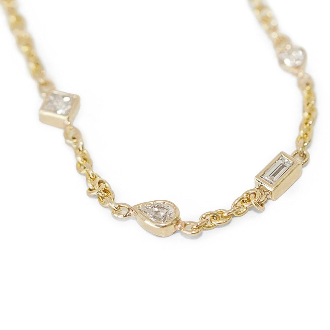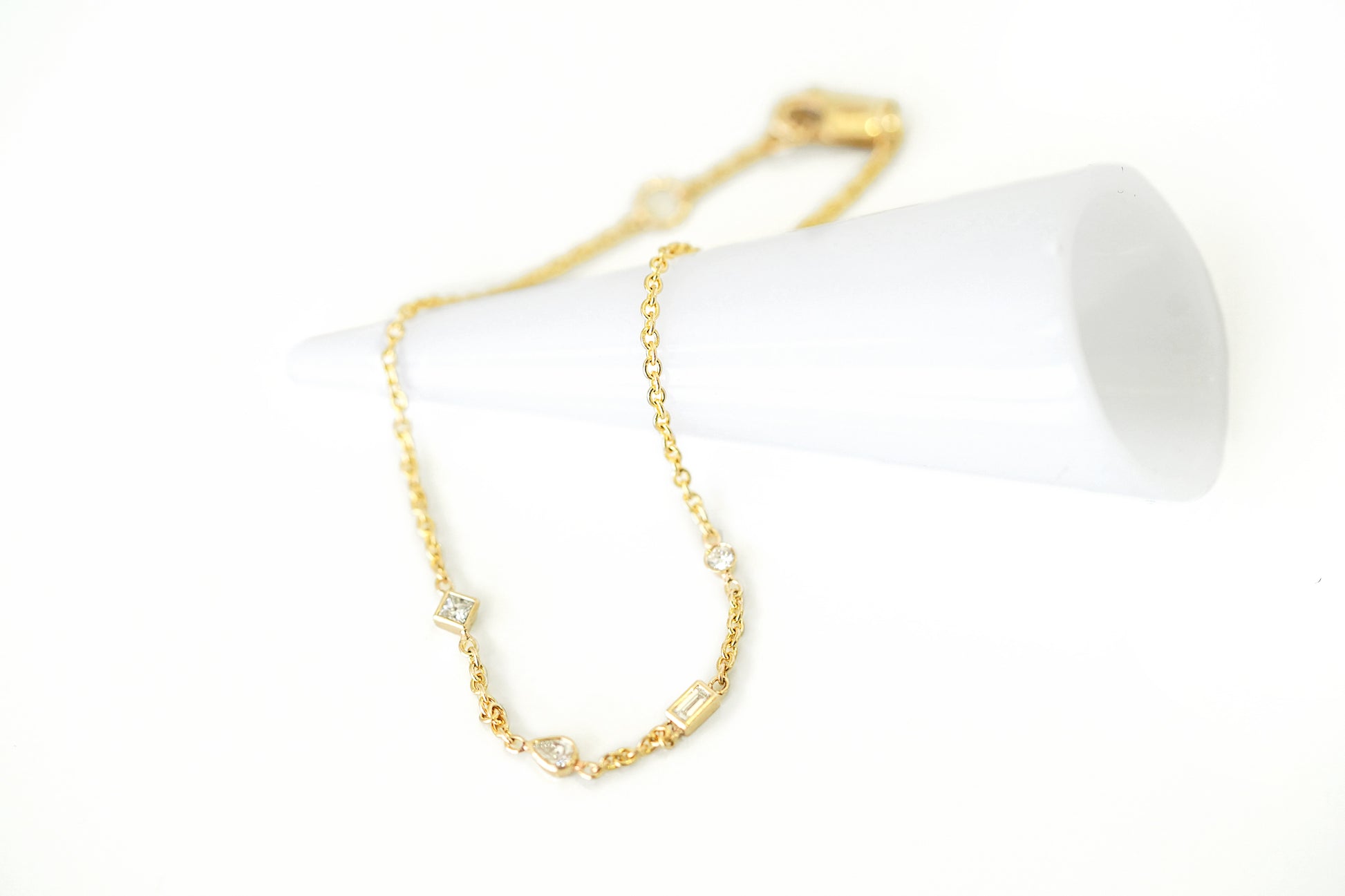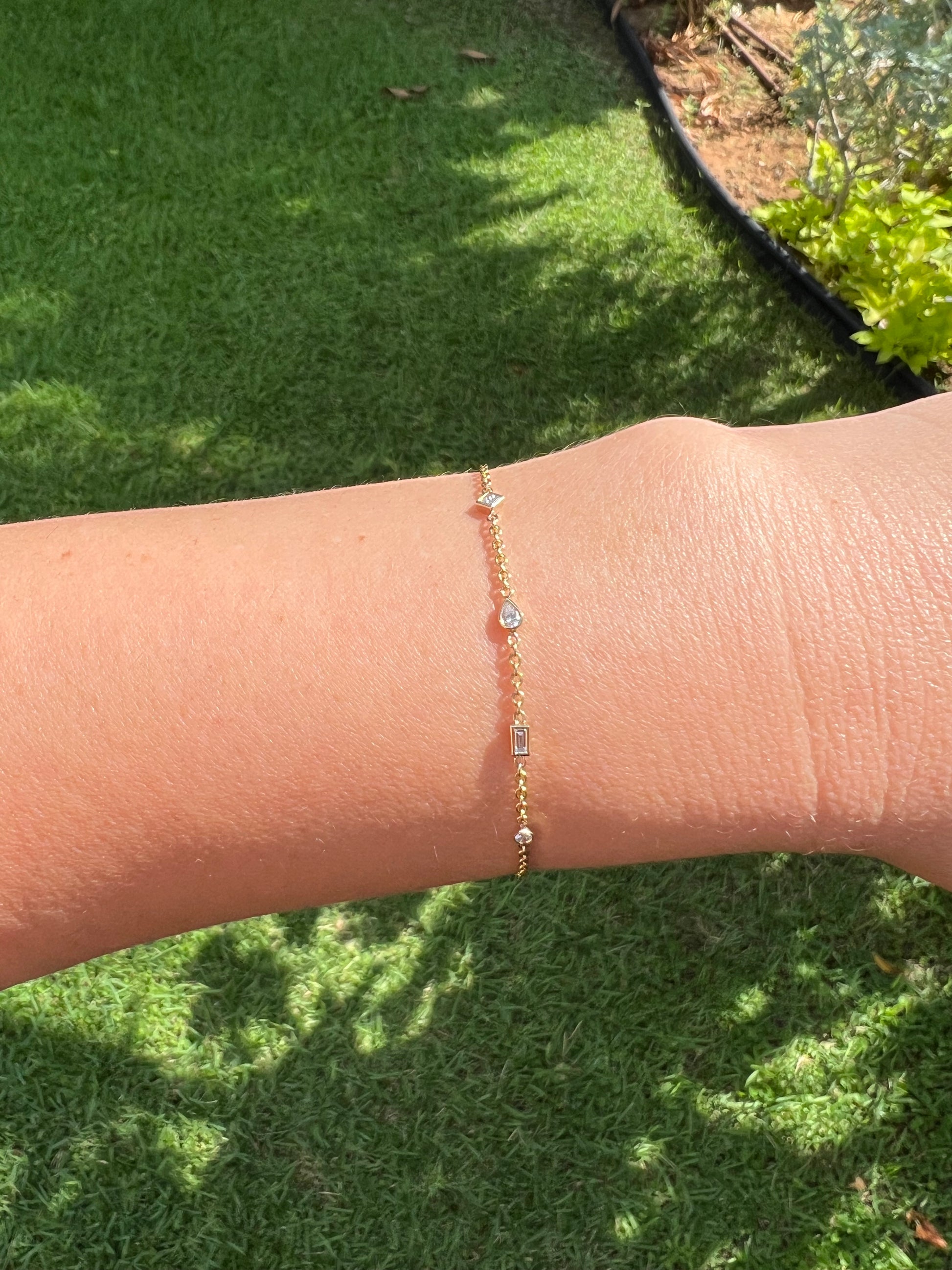 בתמונה צמיד עם 4 יהלומים - פרינסס, טיפה, בגט ועגול, סה"כ קראט 0.28